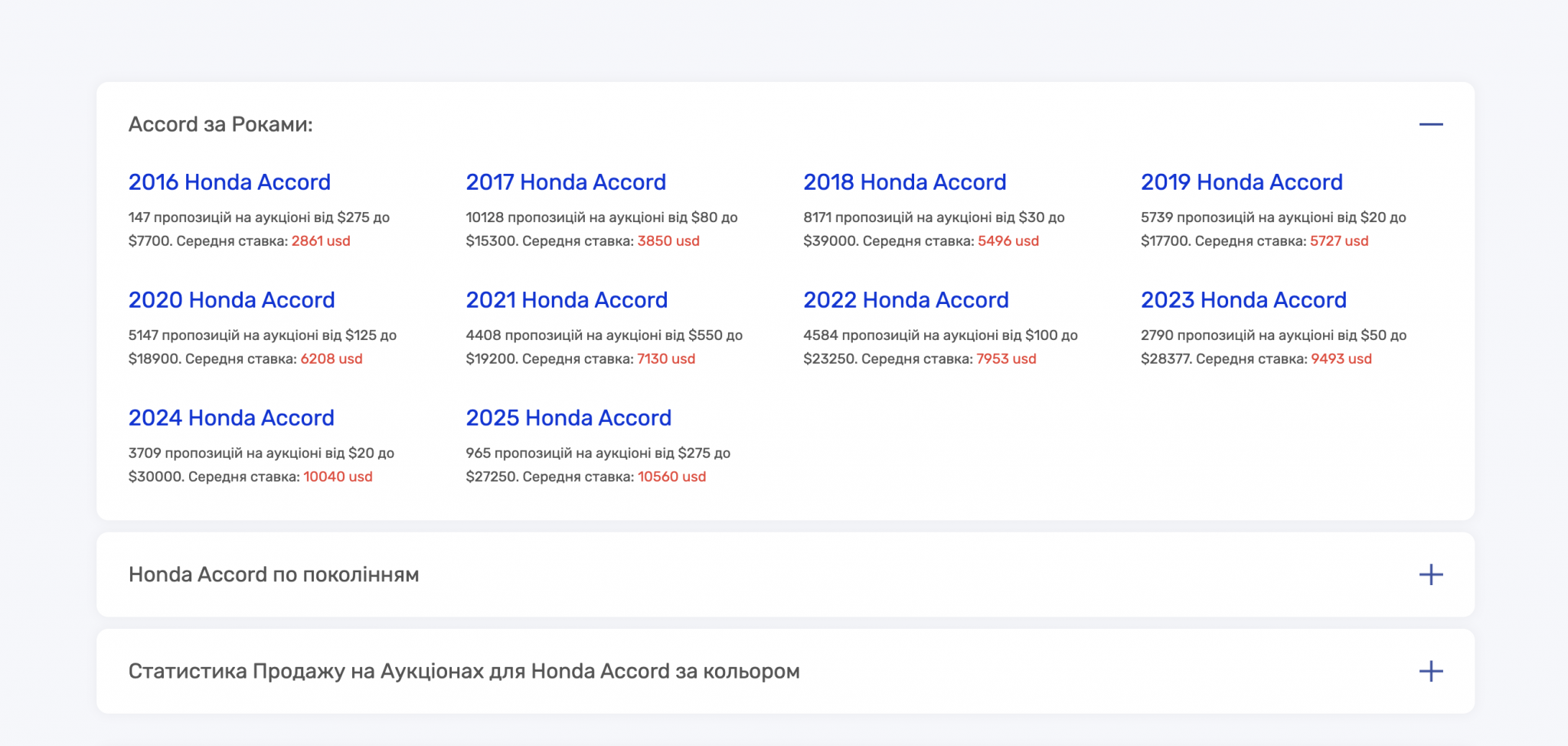 Висновок: Обирайте покоління з великою кількістю лотів (більше 5,000) – там простіше знайти вигідну ціну при покупці авто з США.