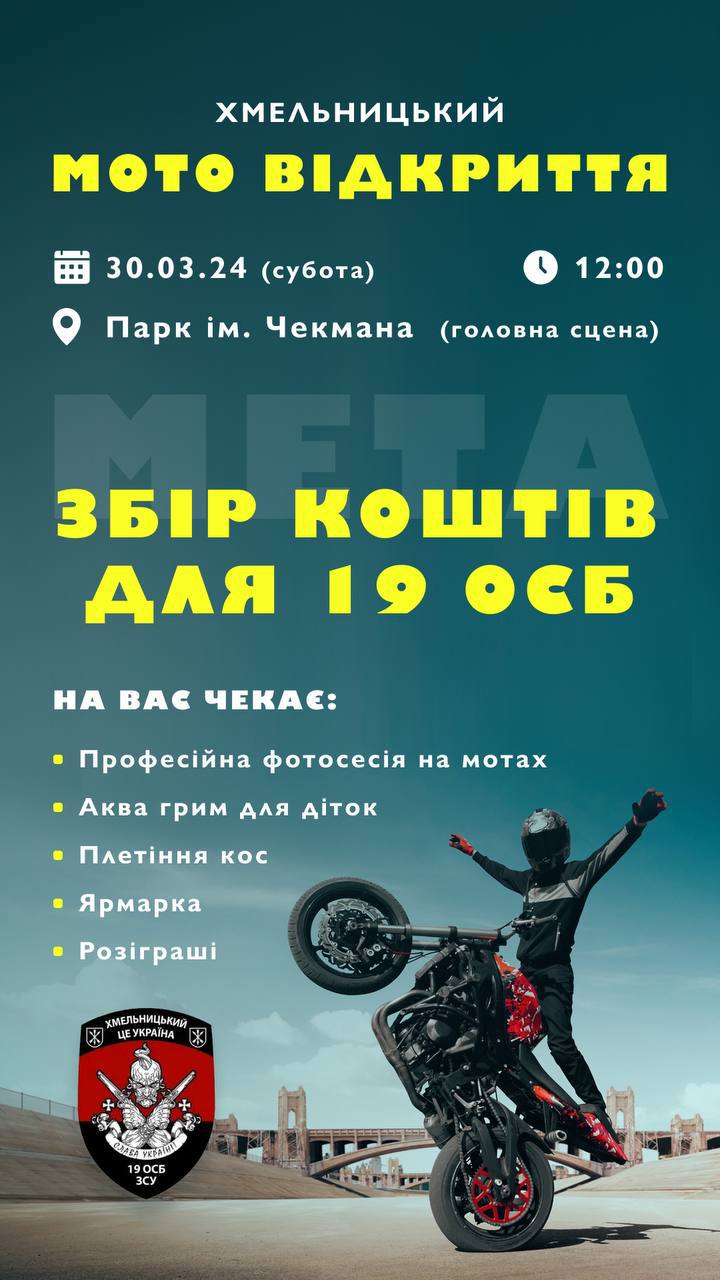 Цієї суботи, 30 березня, в Хмельницькому відкриють мотосезон 2024. Все відбудеться в парку Чекмана, на головній сцені, о 12 годині. Під час заходу проведуть конкурси та аукціони. Також там відбудеться ярмарок, на якому продаватимуть різні речі. Увесь дохід з цього спрямують на потреби 19 ОСБ.