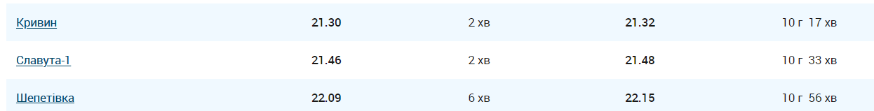 Потяг №45 Ужгород — Харків має аж 45 зупинок. Він курсує через Хмельниччину та зупиняється на трьох станціях. Потяг запізнюється на 2 години 47 хвилин. Тож подаємо розклад лише для них: