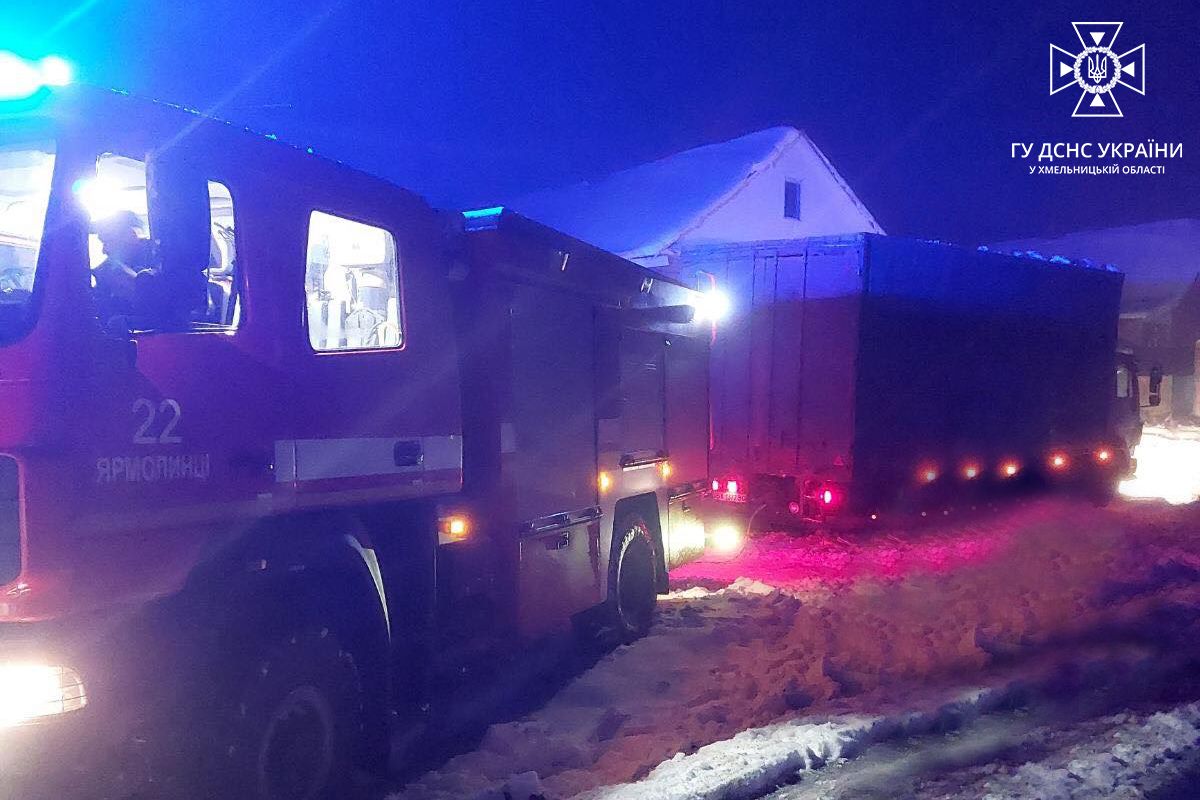 Згодом, о 23:30, рятувальникам повідомили, що у селі Сутківці Хмельницького району, вантажівка “Mercedes 1617” застрягла на засніженому узбіччі та не може самостійно виїхати на дорогу.