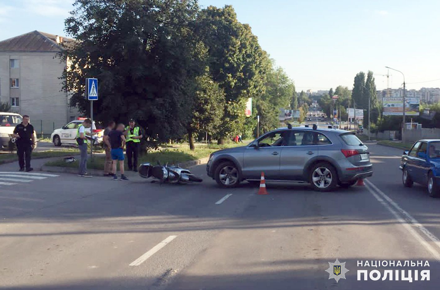Ще одна дорожньо-транспортна пригода сталася близько 16:15 години по вулиці Трудовій. 30-річна водійка «Audi» створила аварійну ситуацію. Внаслідок цього 43-річний водій скутера «Speed Gear» упав та травмувався. Його госпіталізували до Хмельницької міської лікарні.