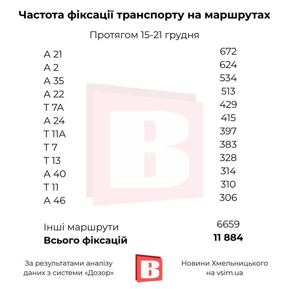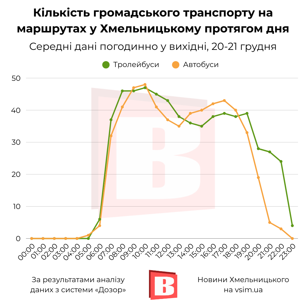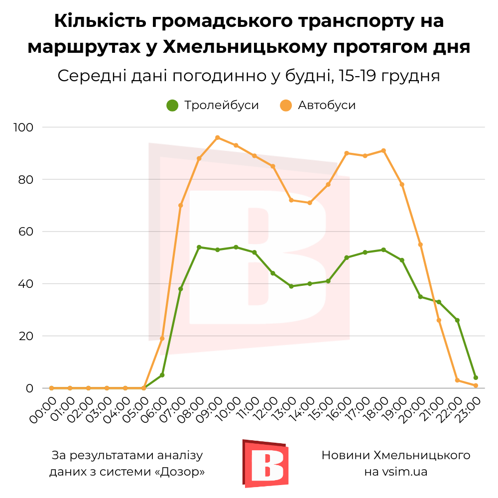 За даними «Дозора» журналіст vsim.ua проаналізував дані про громадський транспорт Хмельницького за тиждень, 15-21 грудня. Інформація з системи збиралася щогодини з точністю до кількох хвилин. Згідно з отриманими даними, транспорт у Хмельницькому починає працювати після 05:00.