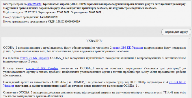 Тому Хмельницький міськрайонний суд ухвалив визнати водія винним, але звільнити від відбування покарання з іспитовим строком 2 роки. Окрім того, накладений арешт на автомобіль скасували і повернули власникові. До слова, суд також не зобов'язав сплатити обвинуваченого моральну компенсацію, про що йдеться в ухвалі суду.