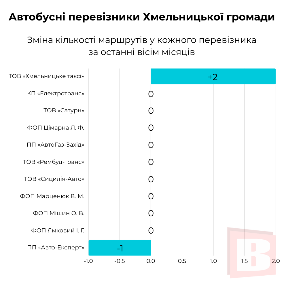 Наш попередній матеріал про хмельницьких перевізників вийшов у червні минулого року. З того часу у Хмельницькому припинило працювати приватне підприємство «Авто-Експерт», яке обслуговувало маршрут №28. Крім того, два маршрути додалися у ТОВ «Хмельницьке таксі» — №28 та №46. Далі інфографіки з загальними даними та інформація про кожного перевізника з аналітичної системи «YouControl».