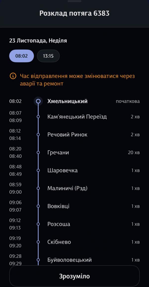 Застосунок одразу підтягує найближчі рейси: на 08:02 та 13:15. Тут же можна переглянути повний розклад — де саме та о котрій годині поїзд буде у кожному населеному пункті.