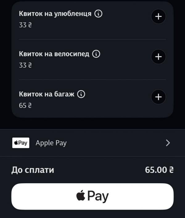 Також доступні додаткові опції: перевезення улюбленця — 33 грн, велосипед — 33 грн, багаж — 65 грн.