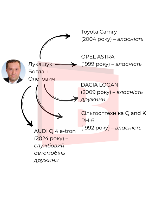 Службовим авто поповнився перелік транспортних засобів у декларації Богдана Лукашука. Його дружина стала користуватися Audi Q4 e-tron, 2024 року випуску.