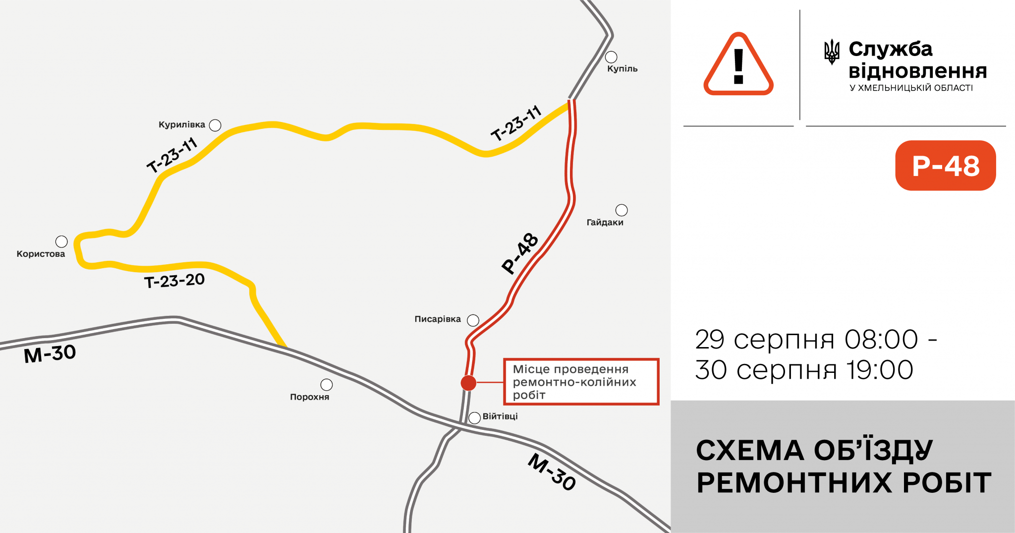 З 8 години 29 серпня буде перекрита ділянка дороги Р-48 Кам'янець-Подільський — Сатанів — Війтівці — Білогір'я, залізничний переїзд 1 267 км, станція Війтівці. Все через невідкладні ремонтно-колійні роботи. Про це повідомляють в Службі відновлення та розвитку інфраструктури у Хмельницькій області.