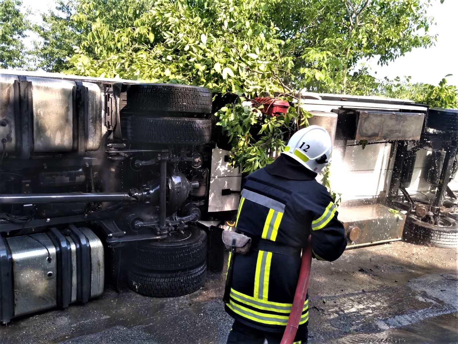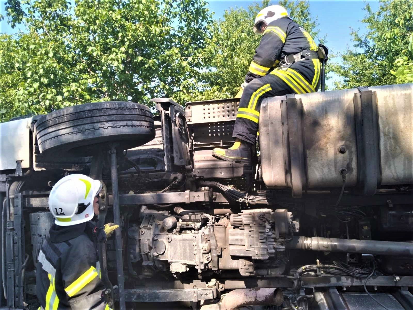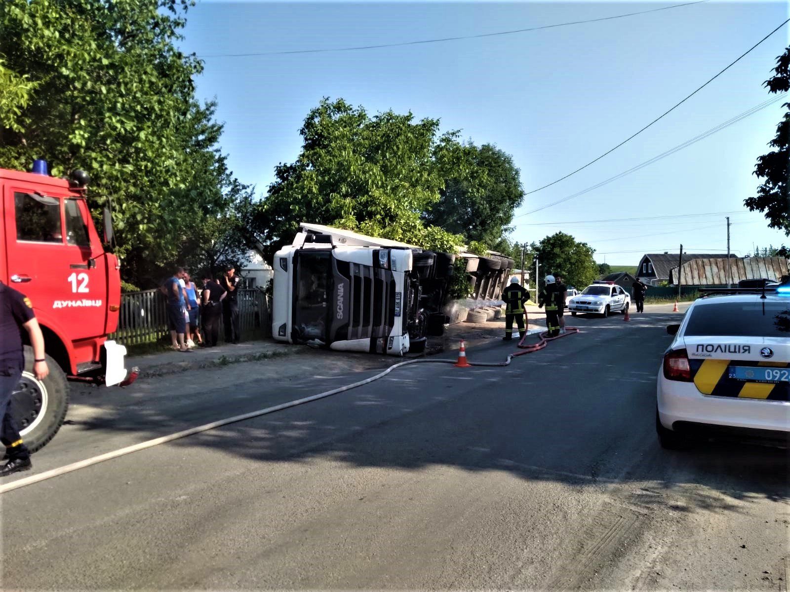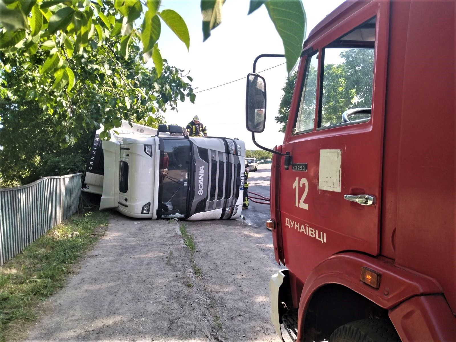 Пригода трапилась у Дунаївцях. 19 червня о 17.41 на пункт рятувальників зателефонували місцеві та повідомили, що по вулиці Богдана Хмельницького перевернулась вантажівка. Надзвичайники, що прибули на виклик, відключили акумуляторну батарею та змили залишки палива й мастила з проїжджої частини дороги, повідомляють в Службі порятунку Кам’янця.