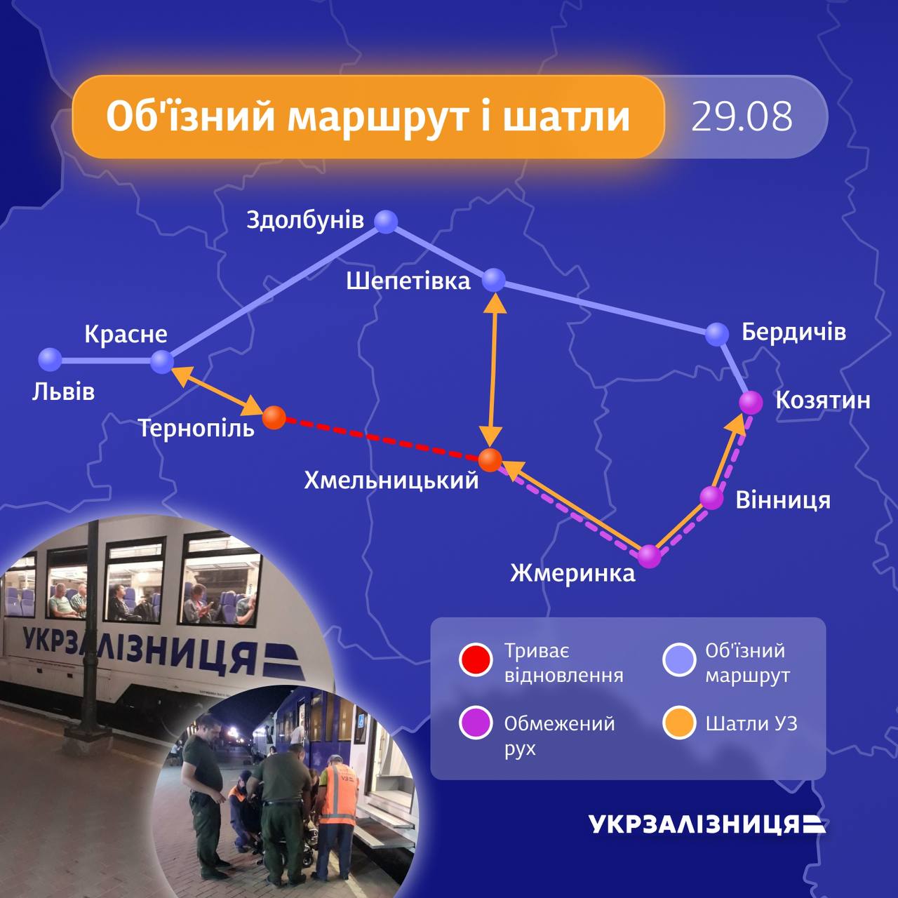 Поки ж на ділянці від Тернополя до Хмельницького, Жмеринки, Вінниці та Козятина рух на час відновлювальних робіт буде обмежено для всіх поїздів львівського напрямку.