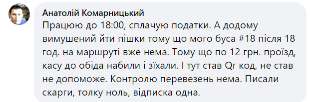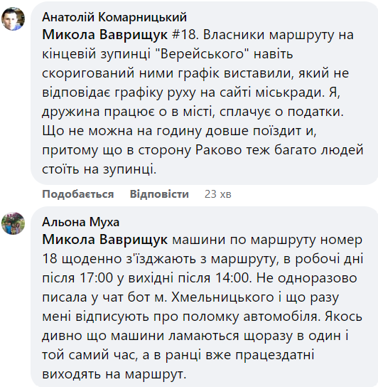 Хмельничани до нововведення ставляться скептично. Вони скаржаться на водіїв приватних перевізників. Кажуть, ті з’їжджають з графіку коли хочуть, а містянам доводиться добиратися додому пішки. Згадують про смарт-зупинки та безкоштовний wi-fi в тролейбусах: