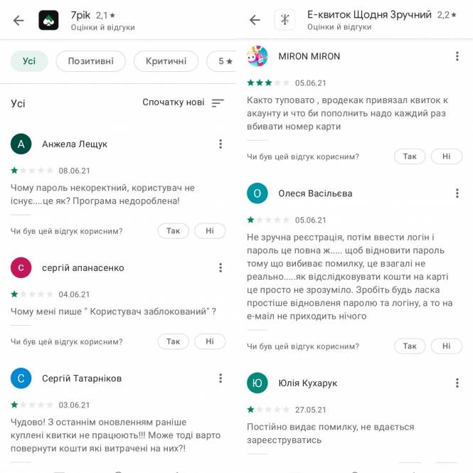 Хай там як, обидва додатки в «Google Play» мають невеликий рейтинг — 2,1 для «7pik» та 2,2 для «Е-квиток Щодня Зручний». Крім того, у коментарях є чимало скарг від хмельничан на технічні негаразди.