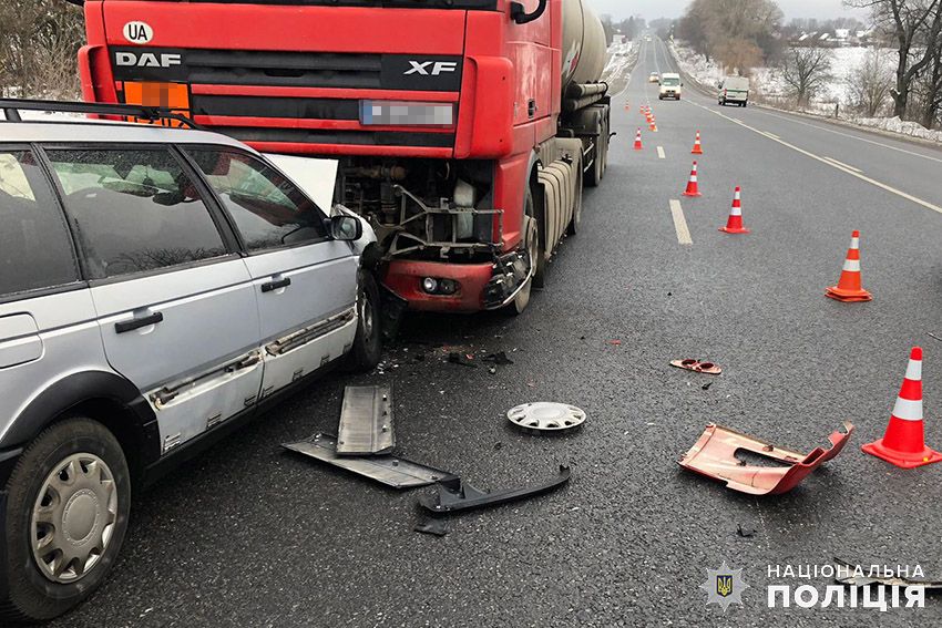 Зіткнулися вантажний автомобіль «DAF» під керуванням 32-річного чоловіка та легковик «Volkswagen», за кермом якого перебував 59-річний житель міста Дунаївці.