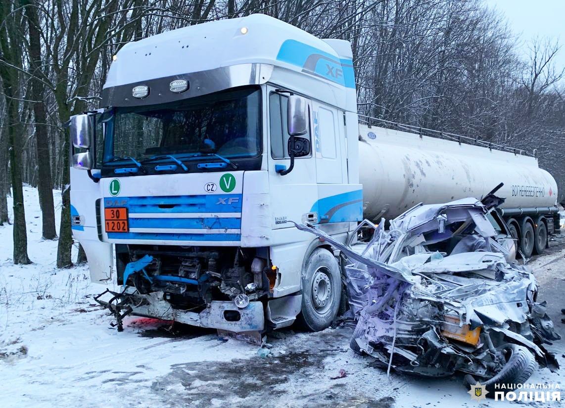 У поліції повідомляють, що автомобіль «Volkswagen Passat» на швидкості виїхав на смугу зустрічного руху. Там боком зіткнувся з бусом «Mercedes Sprinter». Потому легковик врізався у вантажівку-автоцистерну «DAF», яка перевозила пальне.
