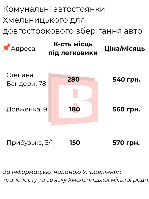 У Хмельницькому є три автомобільні стоянки, які перебувають на балансі комунального підприємства по організації роботи міського пасажирського транспорту. Кількість місць під легкові автомобілі – від 150 до 180. Ціни за місяць коливаються від 540 до 570 гривень. Такою є відповідь управління транспорту та зв’язку Хмельницької міської ради на інформаційний запит від vsim.ua ,станом на 14 жовтня цього року.