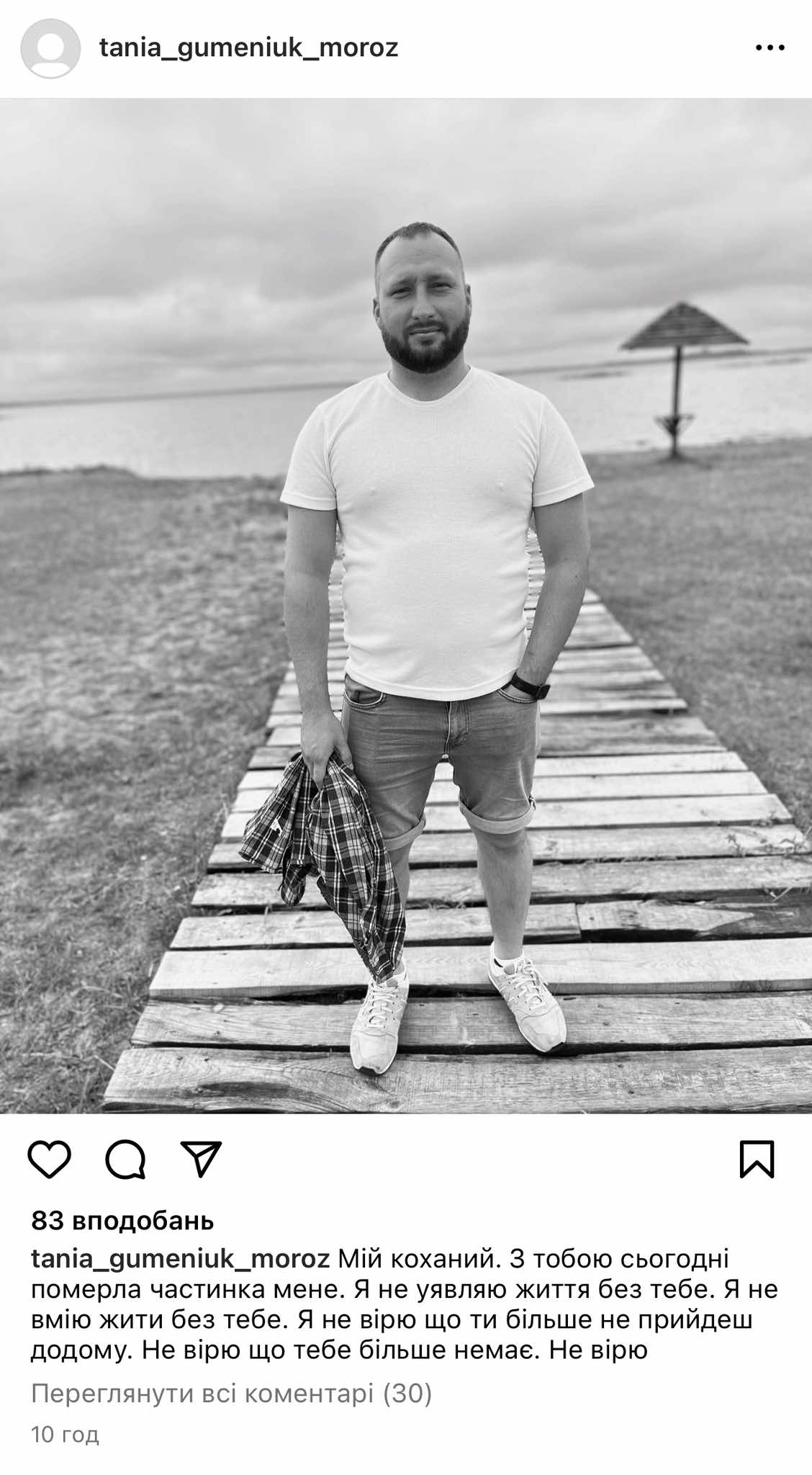 - Мій коханий. З тобою сьогодні померла частинка мене. Я не уявляю життя без тебе. Я не вмію жити без тебе. Я не вірю, що ти більше не прийдеш додому. Не вірю, що тебе більше немає. Не вірю.