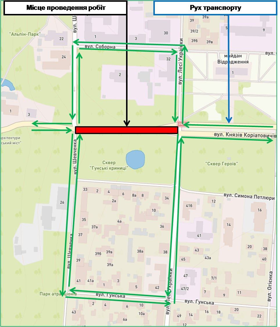 У міськраді зазначили, що об’їзд здійснюватиметься через вулицю Соборну, вулицю Гунську та інші. В муніципалітеті закликали водіїв планувати свої об'їзні маршрути заздалегідь.