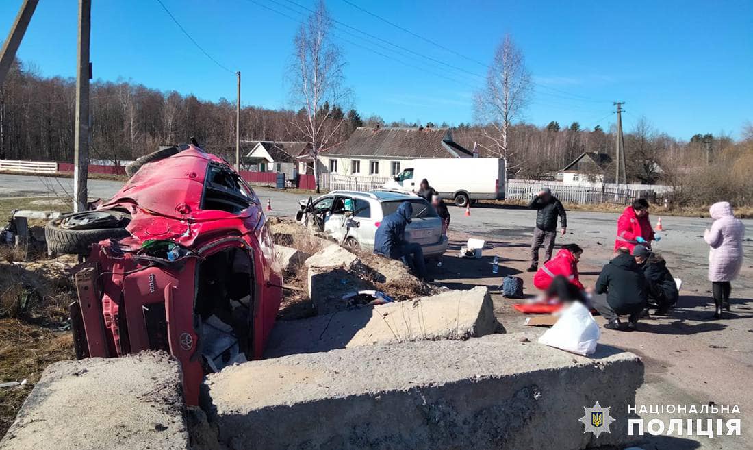 Дорожньо-транспортна пригода сталася сьогодні, 18 березня, близько 10:10 у селі Залужному. За даними слідства, 22-річний житомирянин, водій автомобіля «Toyota Yaris» не розминувся з легковиком «Toyota Avensis». Після того відбулося зіткнення з бетонними блоками та перекидання транспорту.