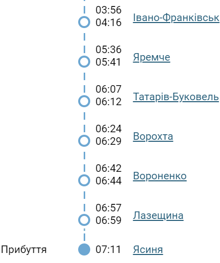 Зазначається, що потяг відправлятиметься з Києва щоденно о 15:02 і прибуватиме до станції Ясіня о 07:11. Зворотно, зі станції Ясіня, поїзд вирушатиме о 17:17 і прибуватиме до Києва о 09:52.
