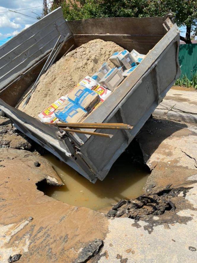 Уже за кілька хвилин у соціальній мережі з'явилося нове відео, на якому видно як на місці потопу під асфальт провалилася вантажівка.