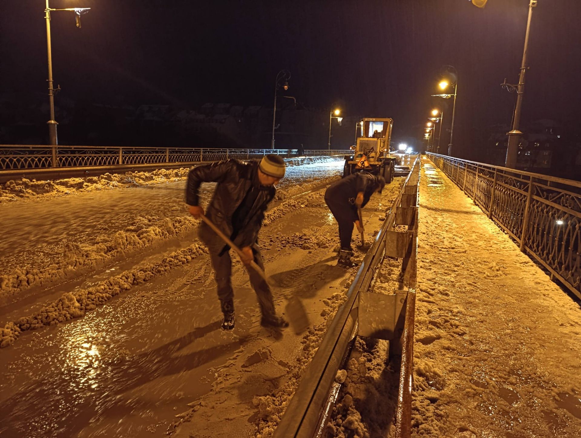 Комунальні служби виїжджали до мостів ще вночі. Працівники розчищали водовідвідні зони.
