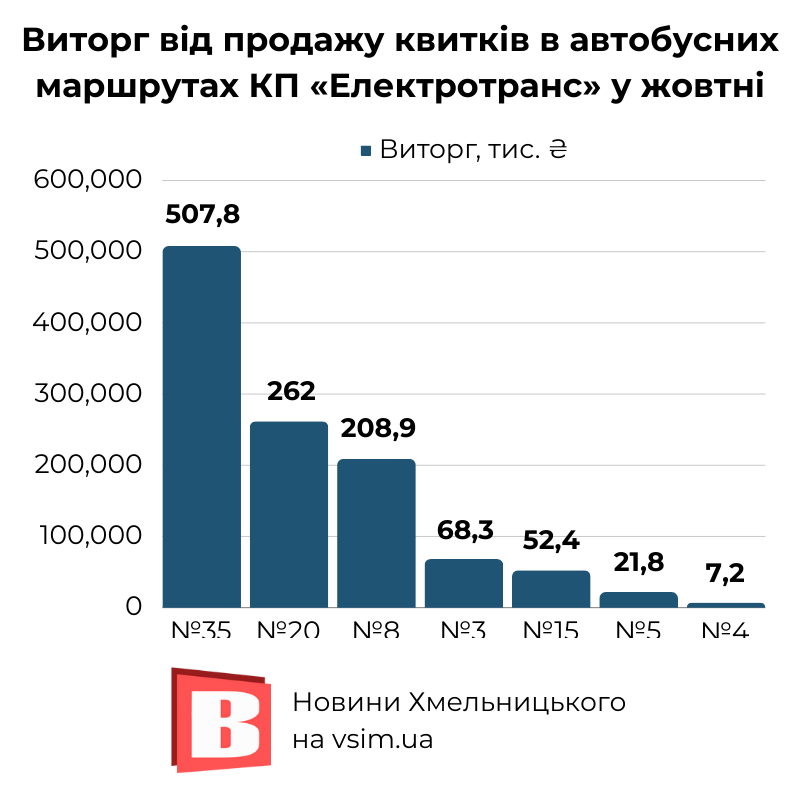 Під час аналізу даних перш за все впадає у вічі значна різниця виторгу між різними маршрутами. Так, рекордсменом був автобус №35, який «заробив» понад 507,8 тисячі гривень. А найменший виторг був за маршрутом №4 — трохи більш як 7,2 тисячі гривень. Таким чином виторг за обома маршрутами відрізняється приблизно у 70 разів.