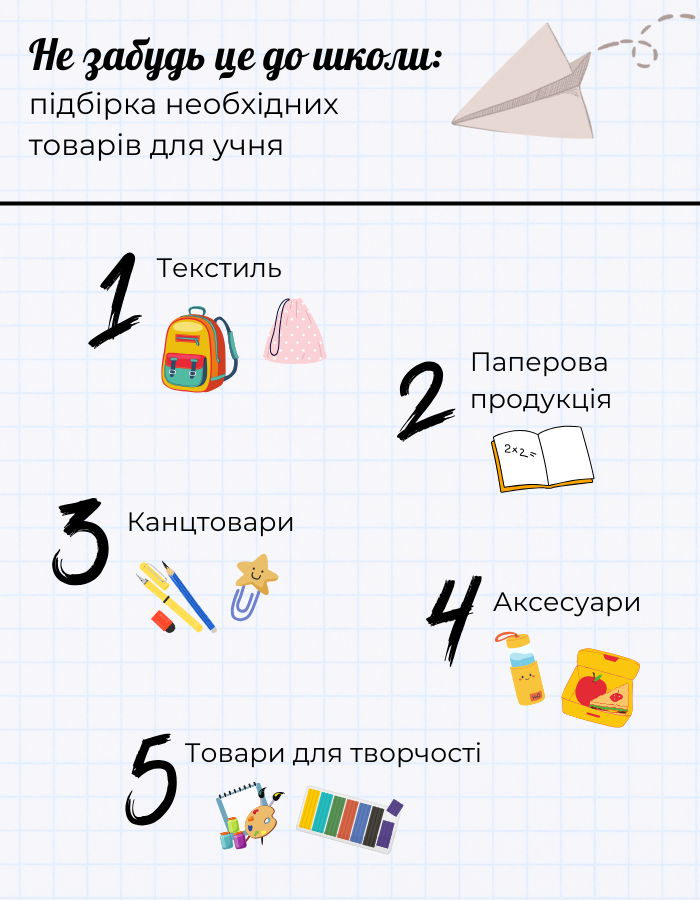 Аби не розгубитися серед асортименту на полицях, підготували для вас перелік з видами товарів, необхідних для учня.