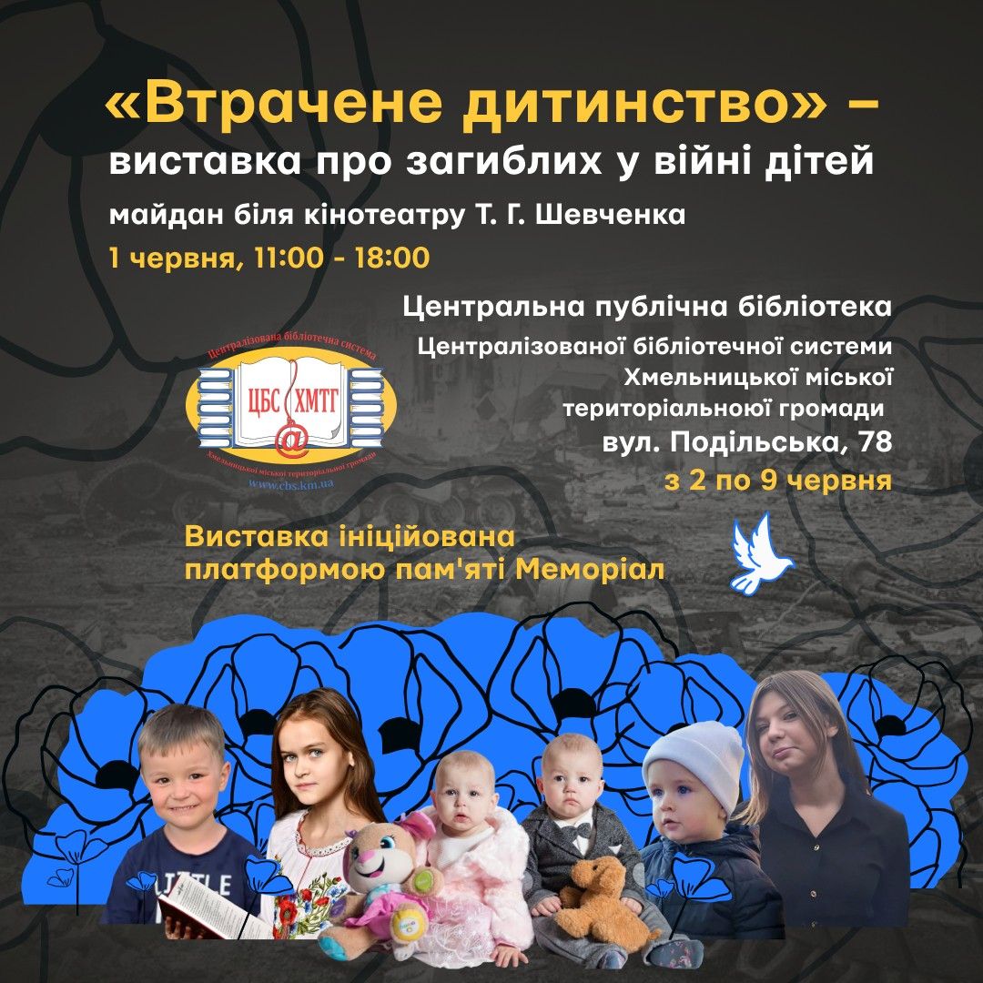 11:00 - 18.00 - виставка "Втрачене дитинство". Вона присвячена дітям, які загинули внаслідок російської агресії за час повномасштабної війни. З 2 по 9 червня матеріали виставки можна буде побачити в Центральній публічній бібліотеці за адресою: вулиця Подільська, 78.