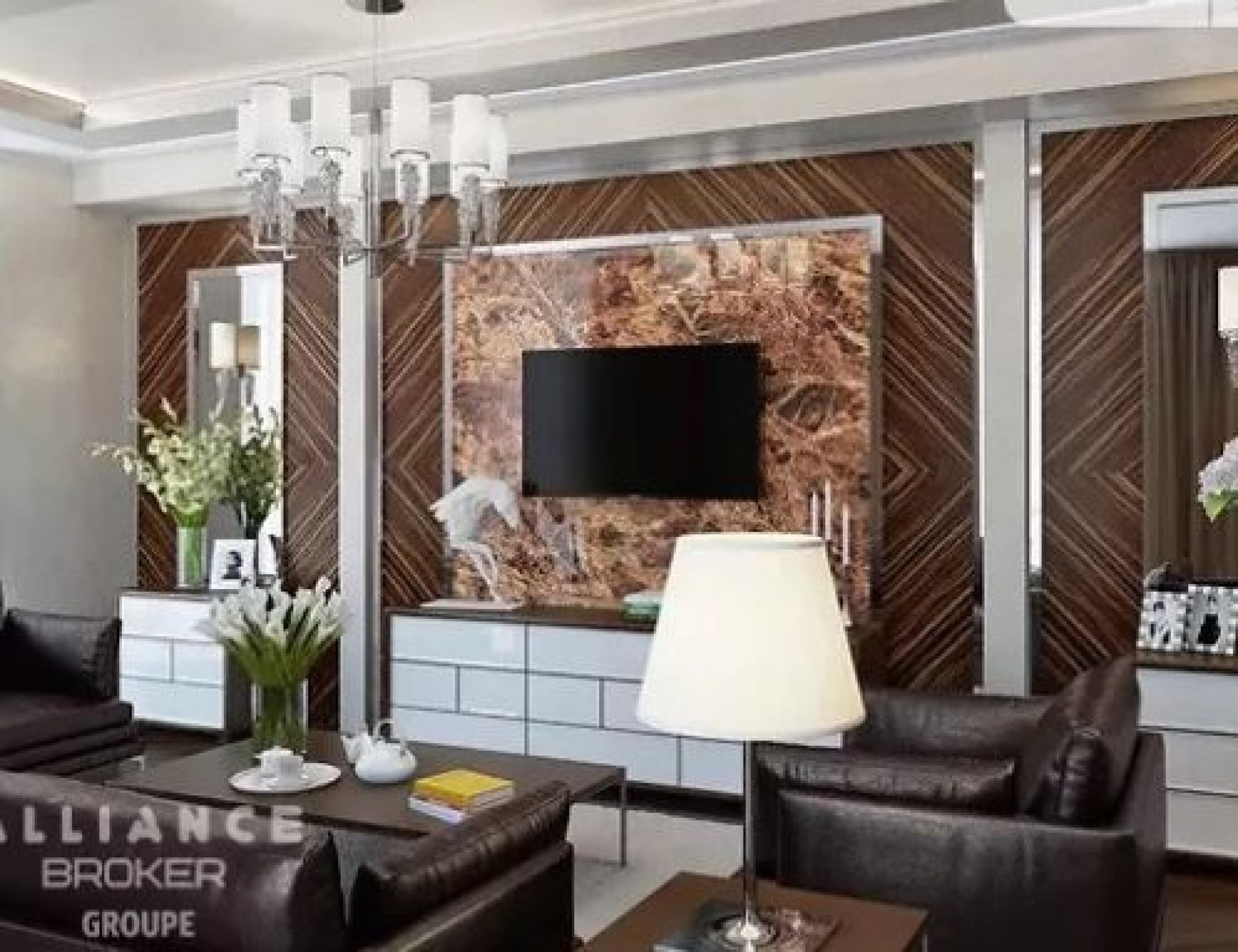 Квартира знаходиться в багатоповерхівці на 10 поверсі. Вона є дворівневою. Є камін і панорамний вигляд на місто. Серед інших особливостей - розкішний ремонт з використанням коштовних матеріалів.