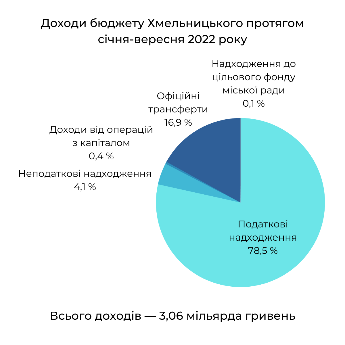 Тим часом Хмельницький протягом січня-вересня отримав до бюджету майже 3,06 мільярда гривень. Видатки за той же період склали 2,22 мільярда. Таким чином міський бюджет отримав приблизно на 840 мільйонів більше, ніж витратив.