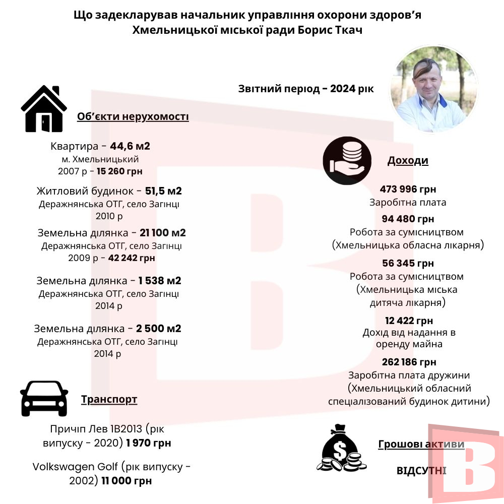 За основним місцем заробив 473 996 грн. Як ми уже згадували вище, Борис Ткач – лікар-нейрохірург. Ним він працює в Хмельницькій обласній лікарні й одержав за це 94 480 грн. За сумісництвом також у Хмельницькій міській дитячій лікарні, де його зарплата у 2024-му склала 56 345 грн. Мав дохід від надання в оренду майна фермерському господарству – 12 422 грн. Його дружина, працюючи в Хмельницькому обласному спеціалізованому будинку дитини, заробила 262 186 грн. Грошових активів у родини немає.