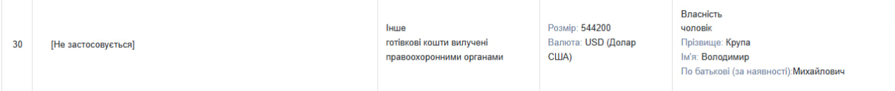 Водночас у грошових активах з’явилася нова сума — 544 200 доларів, які, як вказала експосадовиця, належать її чоловікові — Володимиру Крупі. Сума така ж як і була знайдена у двох сумках, які згідно з даними правоохоронців, Крупа викинула через вікно в день обшуків. Навпроти цих коштів стоїть позначка: вилучено правоохоронними органами.