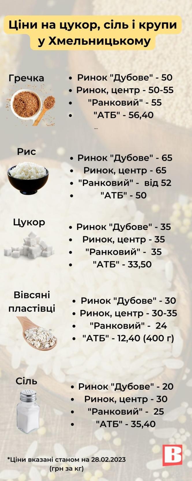 Відтак, ціни на хмельницьких ринках суттєво не різняться. Принаймні на цю групу соціально важливих товарів. Станом на сьогодні, 28 лютого, на ринку "Дубове" дешевше можна знайти гречку, у супермаркеті - цукор за нижчою на кілька гривень ціною.