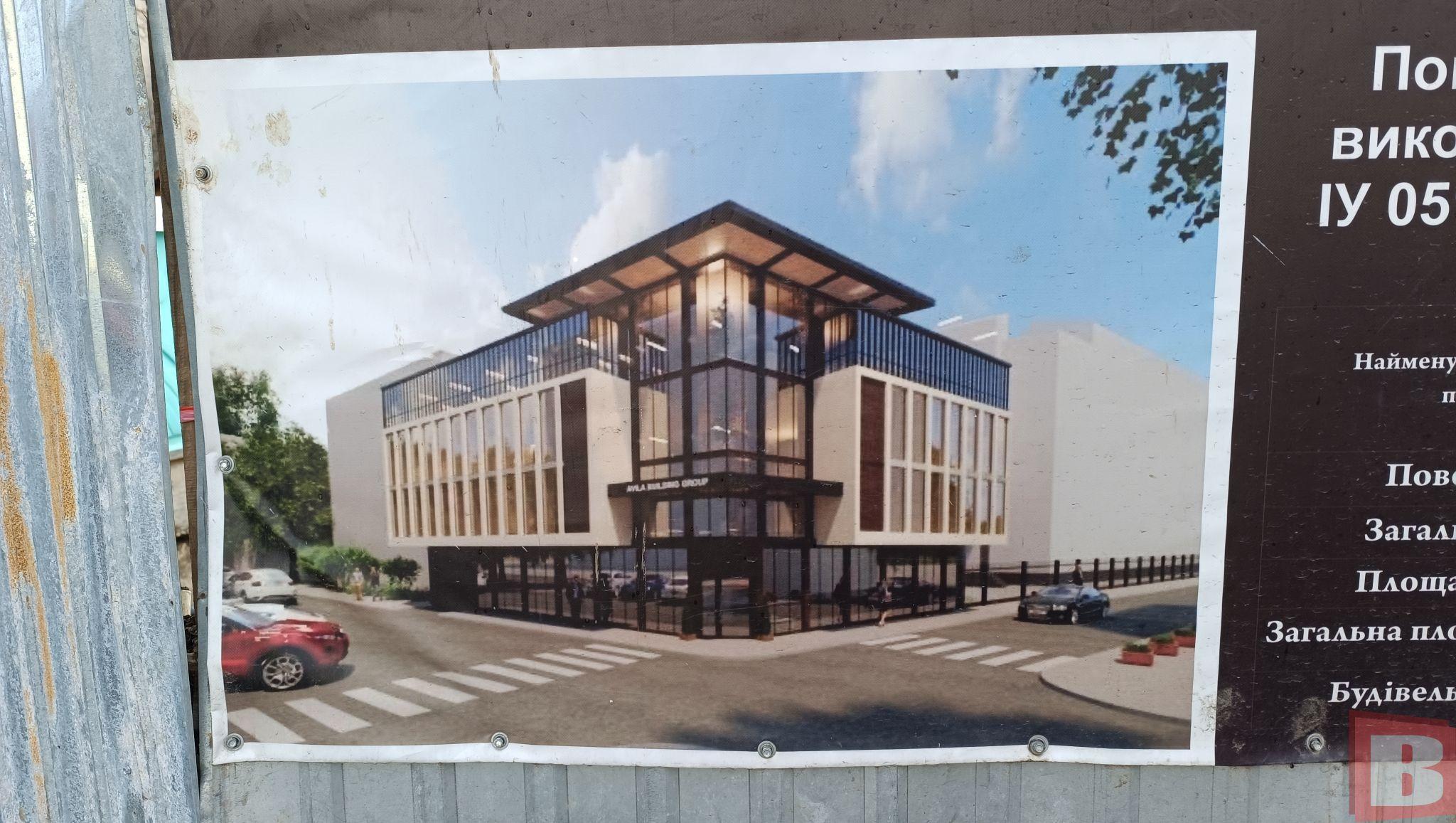 На паркані розміщений паспорт об’єкта, з якого дізнаємося, що саме там будують та хто є замовником робіт. Отож, на цьому місці має з’явитися офісна будівля з комерційними приміщеннями та підземним паркінгом. Вона матиме чотири надземні поверхи та загальну площу в майже 2162 квадратних метри. На рендері споруди можна помітити напис «Avila Building Group».