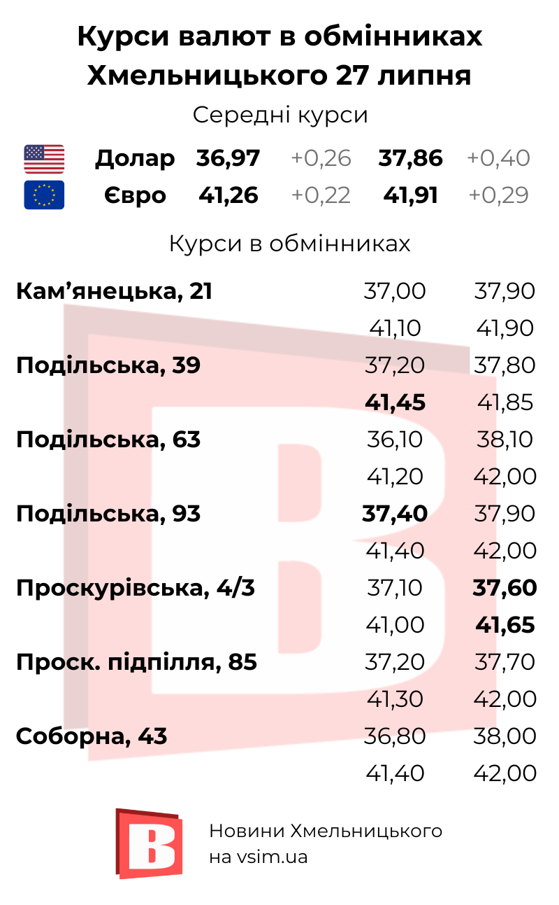 Середні курси валют в обмінниках Хмельницького станом на сьогодні, 27 липня, переглядайте нижче. Сірим кольором вказана різниця проти минулого четверга, 20 липня. Жирним кольором виділені найвигідніші курси.