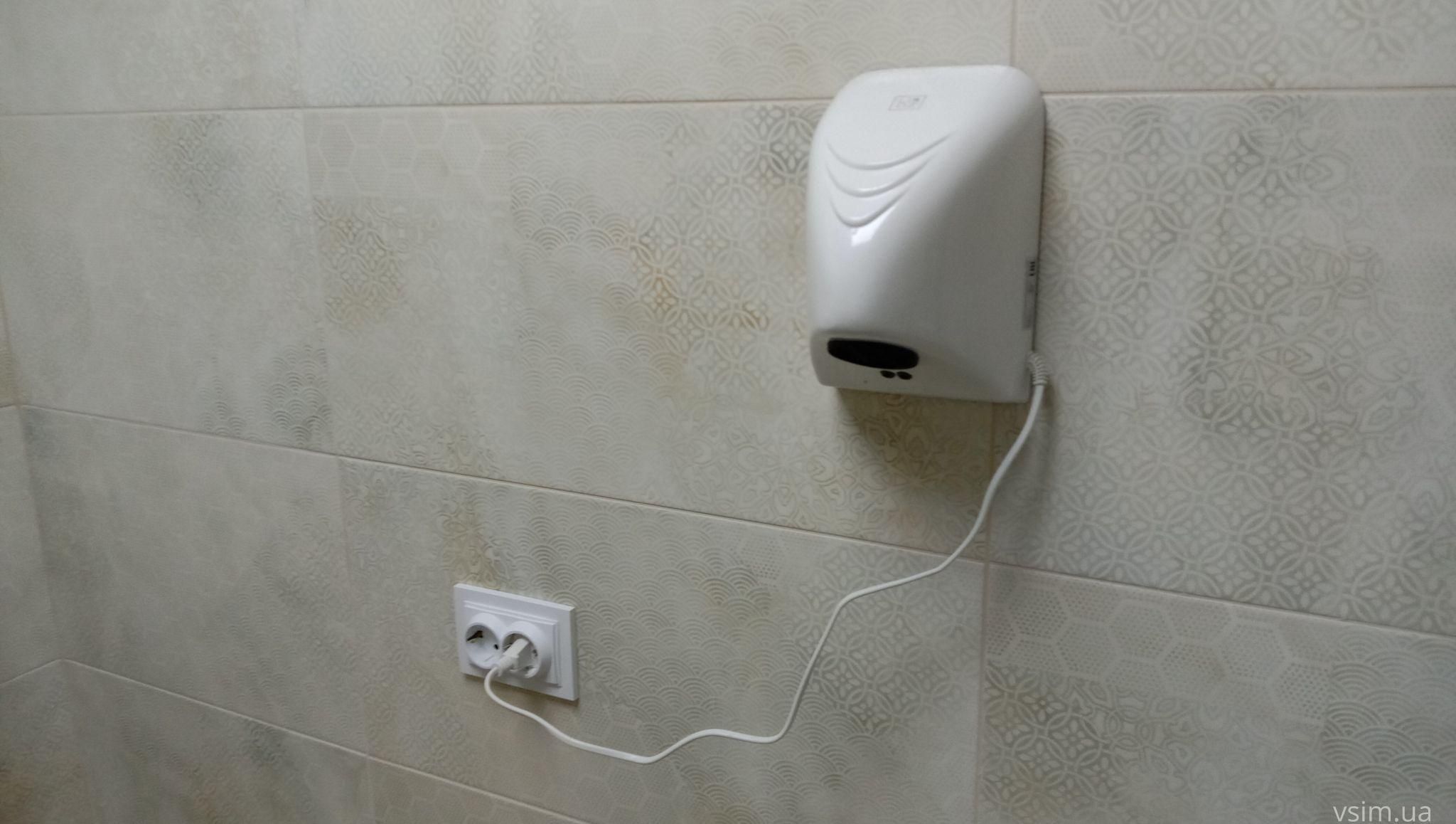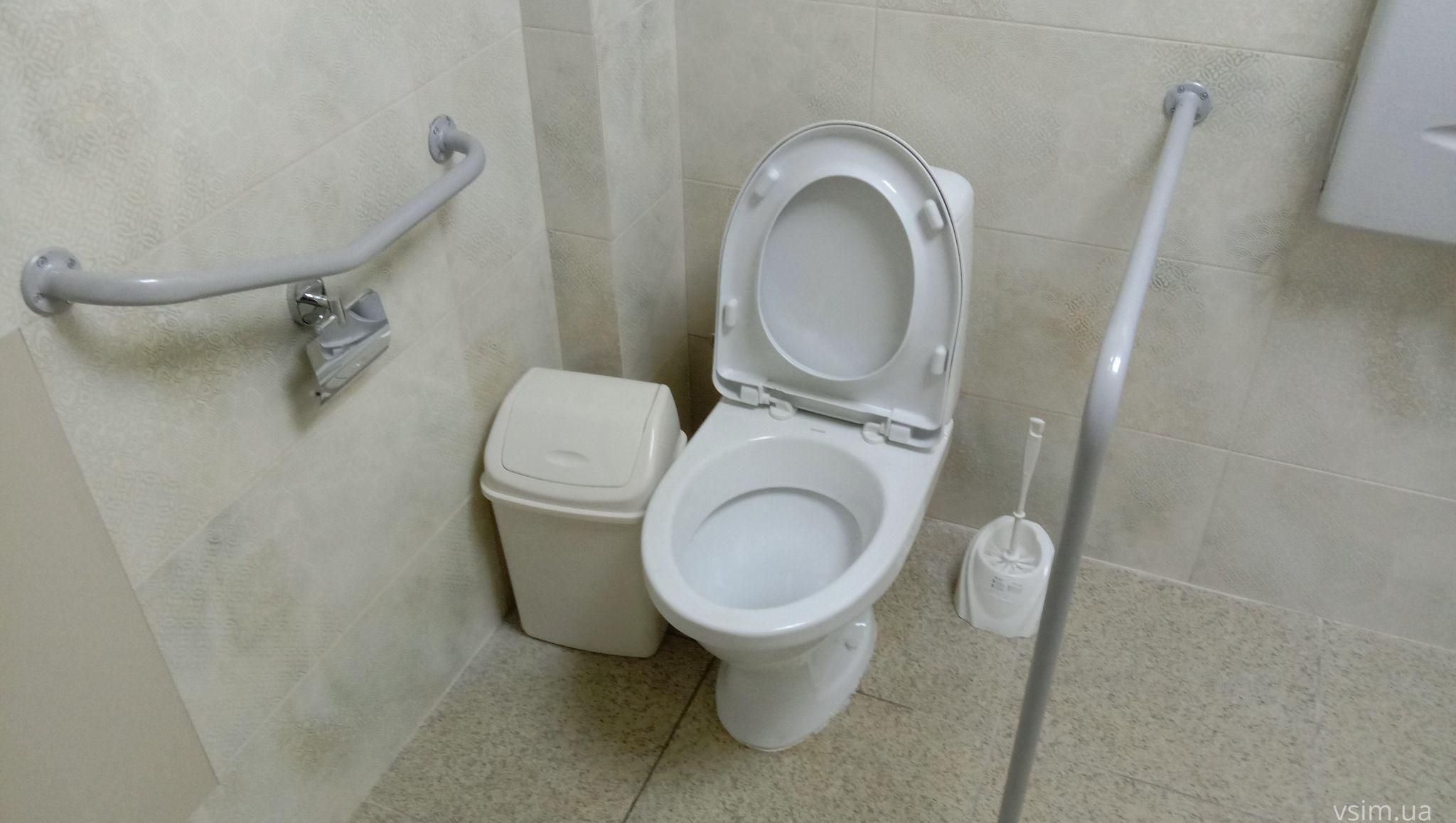 Туалет для відвідувачів є безкоштовним та налічує дві однакових кабінки. У кожній з них є унітаз, раковина (вода у кранах тільки холодна), урна, сушарка для рук, пеленальний столик, диспенсер для рідкого мила та обігрівач. Для людей з інвалідністю передбачені поручні. На момент відвідування журналістом — 17 листопада близько 17:00 — у диспенсерах не було мила.