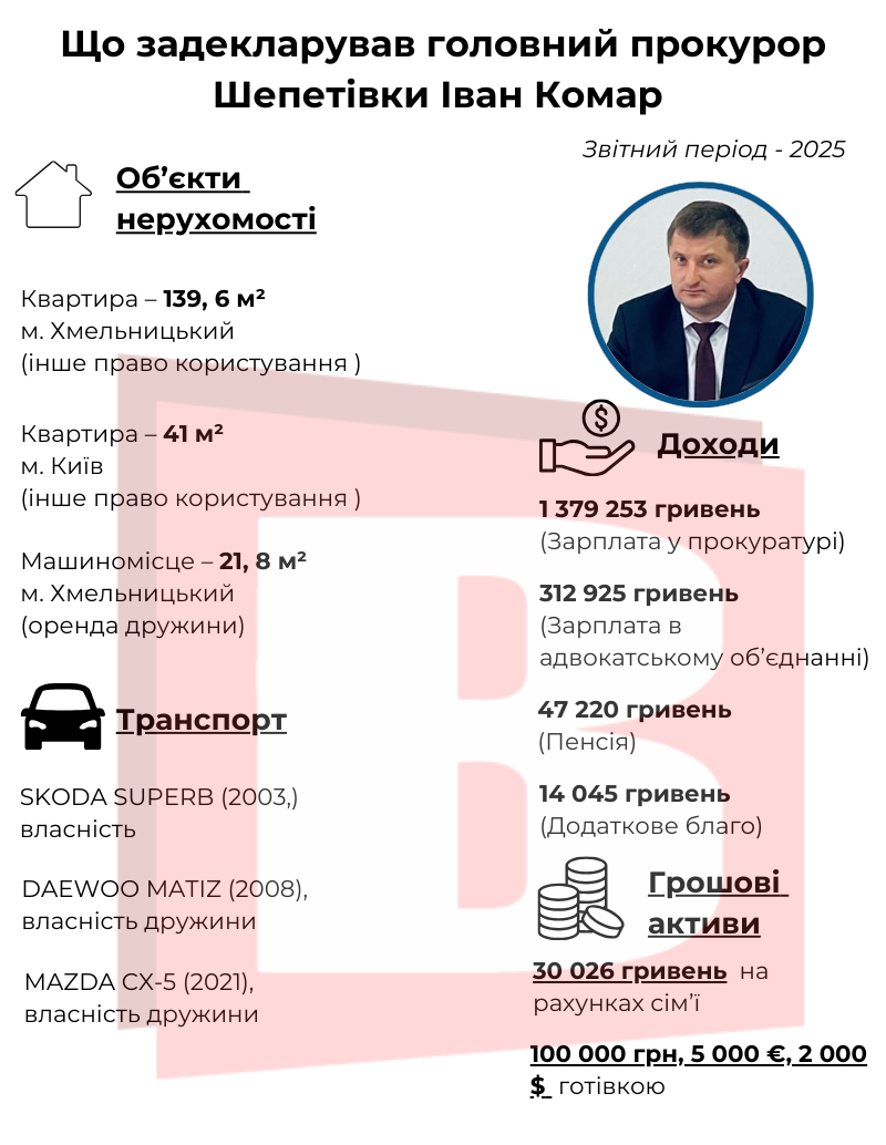 Іван Комар подав свою декларацію 27 лютого. Прозвітував за 2025 рік. Його річна заробітна плата за цей період — майже 1,4 мільйона гривень. Це близько 115 тисяч на місяць. У 2024-му він заробив більше — приблизно 1,5 мільйона.