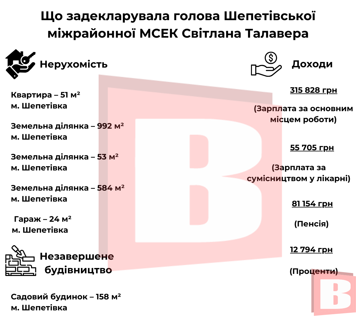 У ній вона вказала об’єкти нерухомості, які перебувають у її власності, а також доходи. Наприклад, окрім зарплати за основним місцем роботи, Талавера працює за сумісництвом у Шепетівській багатопрофільній лікарні, а також отримує пенсію.