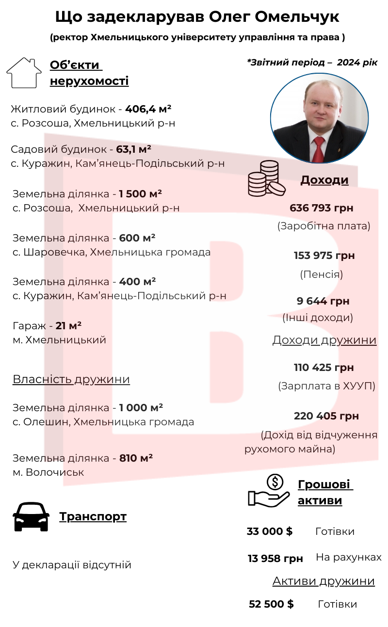 Так, у минулому році ректор придбав житловий будинок на 400 «квадратів» у селі неподалік Хмельницького. Транспортні засоби у декларації не вказані.
