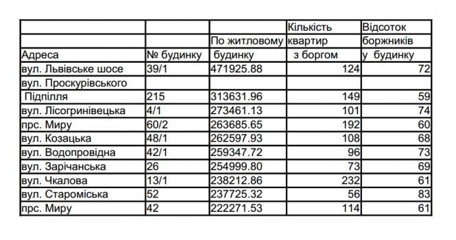 Отож, хто потрапив у ТОП-10 житлових будинків-боржників Хмельницького: