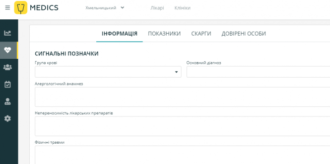 Дешборд - місце для вказування останніх показників здоров’я: вага, тиск, пульс, температура, цукор в крові та зріст. Медична картка містить 4 розділи. В першому - інформація про пацієнта, що називається “сигнальними позначками”. Там можна вказати свою групу крові, основний діагноз, алергологічний анамнез, непереносність лікарських препаратів та фізичні травми.