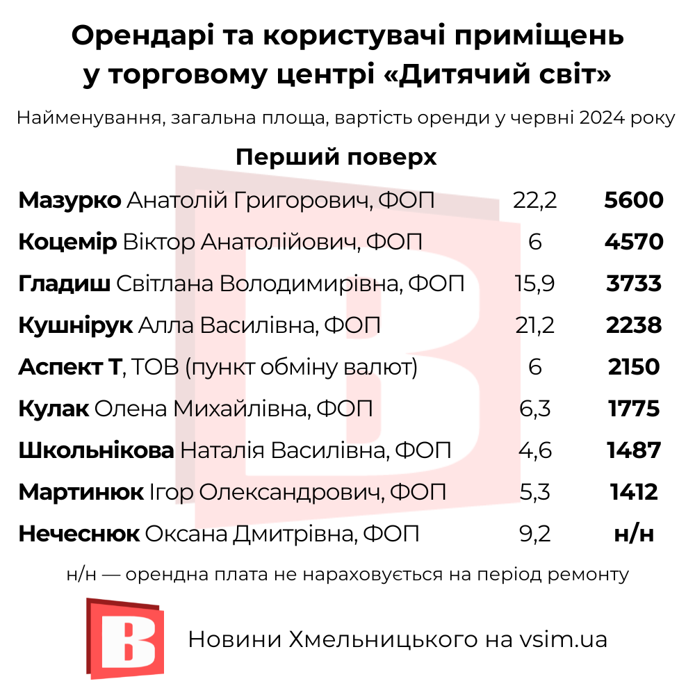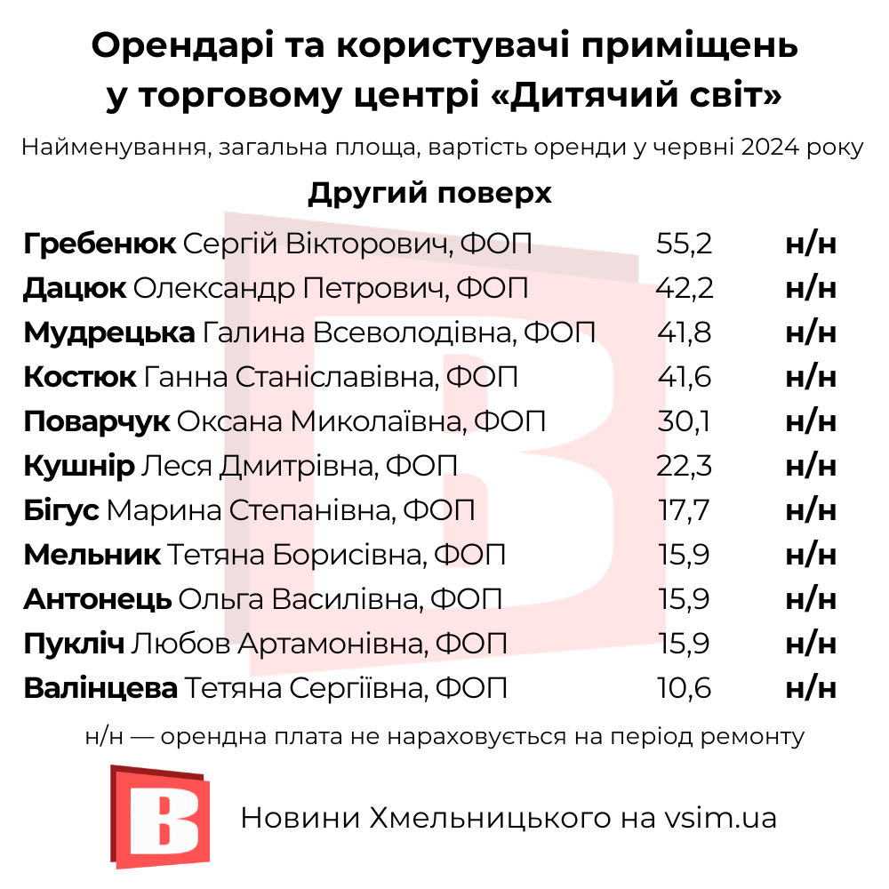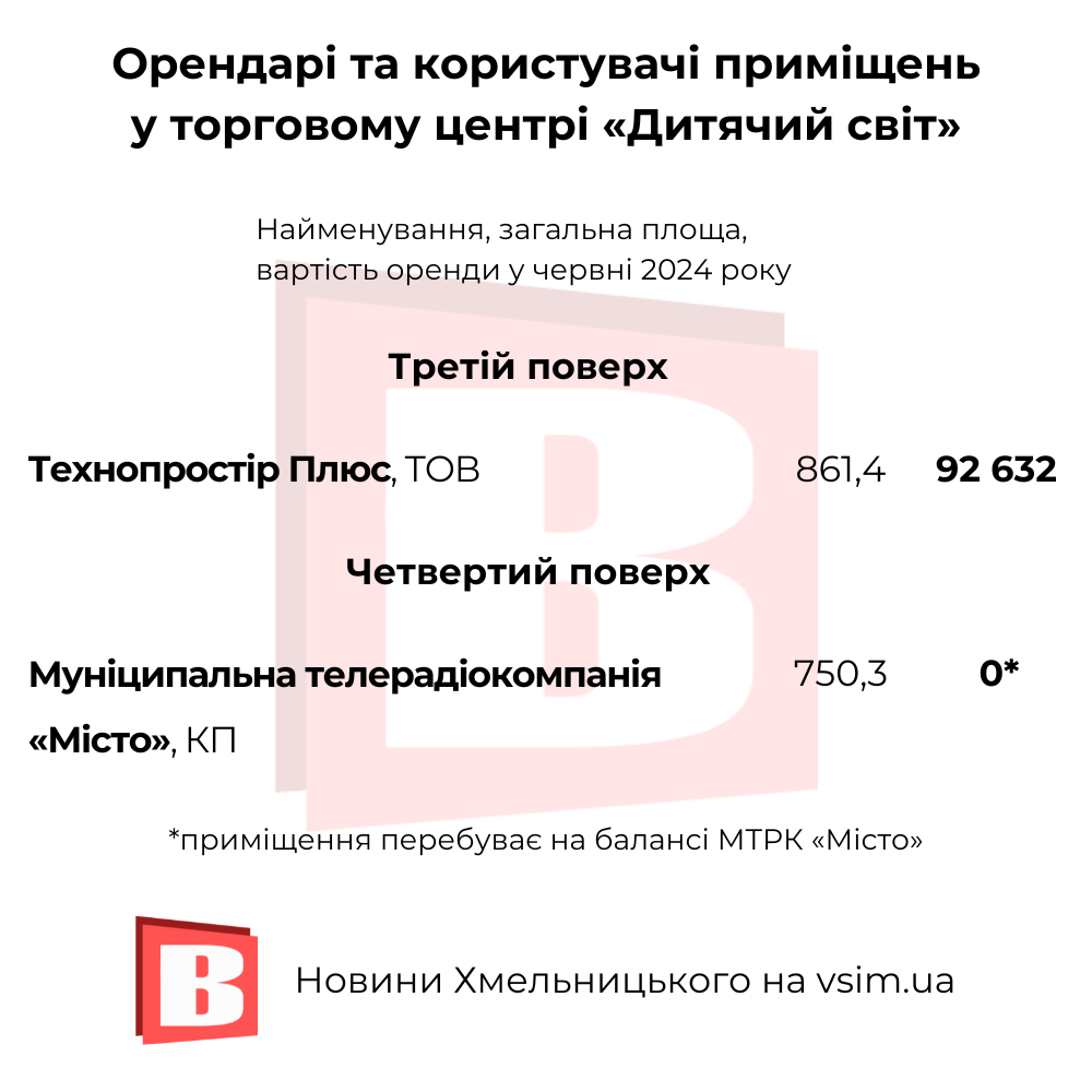 Більшу частину приміщень у «Дитячому світі» орендують ФОПи та приватні компанії. Тим часом приміщення на четвертому поверсі перебувають на балансі та у користуванні комунального підприємства «Муніципальна телерадіокомпанія „Місто“». Такі дані журналісту vsim.ua надали в управлінні житлової політики і майна Хмельницької міськради у відповідь на запит.