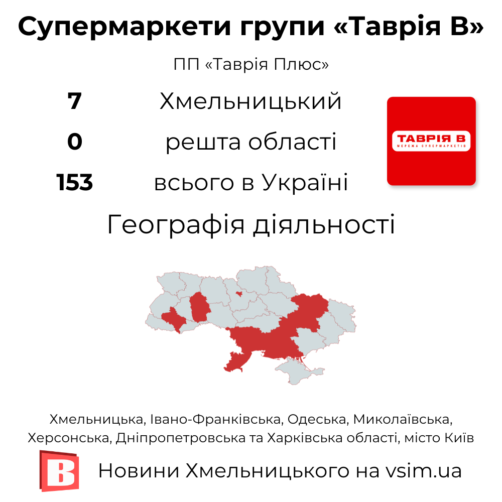 Саме ж приватне підприємство «Таврія Плюс» зареєстроване в Одесі у лютому 2002 року. Кінцевим власником та засновником є Вячеслав Письменюк. Фінансово-промисловій групі «Таврія В» належать також мережі «Космос», «Пюре», «Блиск&Відро» та «Т-Спринт Кафе». Жодна з них у Хмельницькому не представлена.