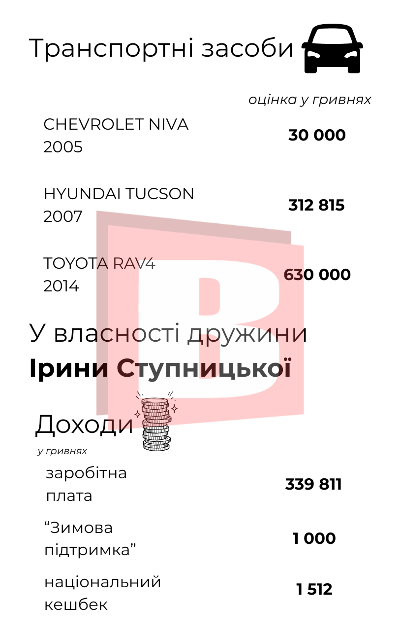Найбільшим джерелом доходу Івана Ступницького є зарплата за основним місцем роботи. За 2025-ий вона склала 1 075 986 гривень. У середньому це майже 90 тисяч гривень на місяць.