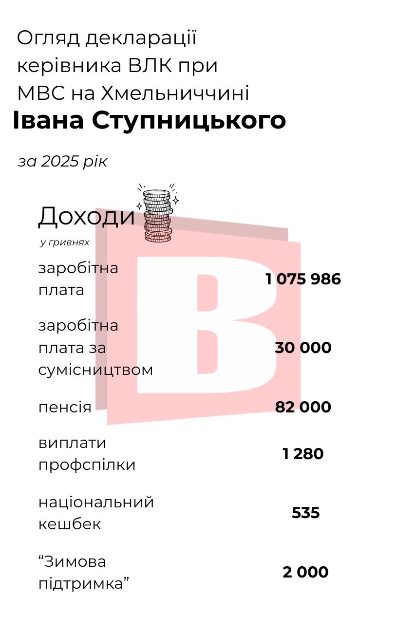 Ми продовжуємо аналізувати статки посадовців. Цього разу – декларація за 2025-ий рік т.в.о. начальника військово-лікарської комісії при МВС по Хмельницькій області Івана Ступницького. Переглядайте далі, скільки він заробив та яким майном володіє.