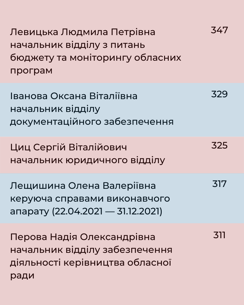 Найбільшу зарплату мав перший заступник голови обласної ради Володимир Гончарук — понад 549 тисяч гривень. На другому місці голова Віолета Лабазюк. Їй нарахували майже 502 тисячі.