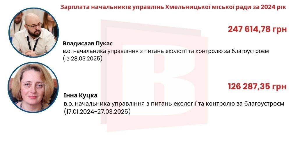 Із 28 березня виконує обов’язки начальника управління Владислав Пукас – головний спеціаліст відділу з питань екології. Щомісяця отримував доплати за заміщення начальника – від 2 628,57 до 3 754 грн. Його посадовий оклад коливався від 5 500 грн до 8 601 грн. Розмір щомісячних премій становив від 7 143,34 до 9 900 грн. У листопаді до Дня місцевого самоврядування отримав разову премію 8 601 грн. У цьому ж місяці були додаткові нарахування за відрядження – 7 296,36 грн. Загалом за 2024 рік Владислав Пукас заробив 247 614,78 грн.