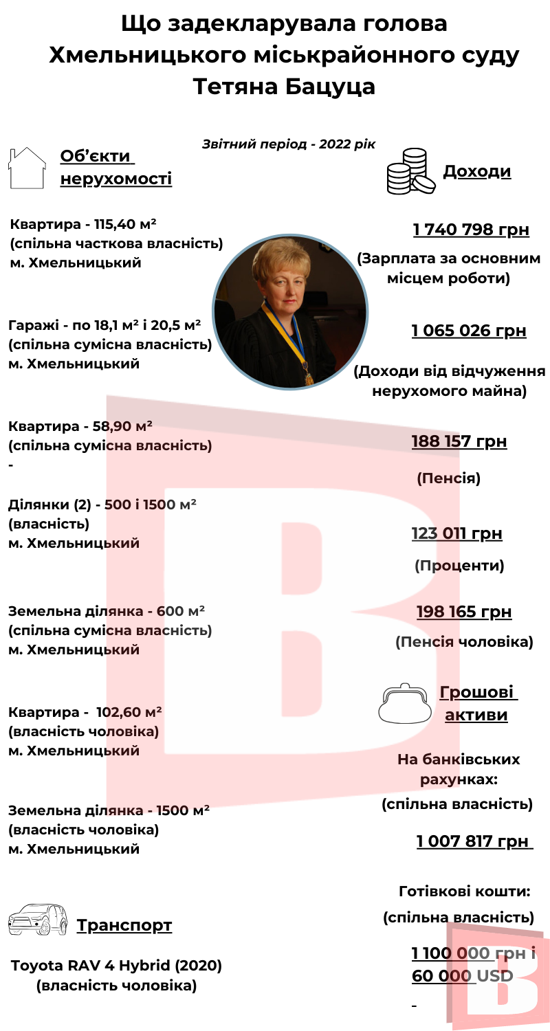 Цього разу проаналізуємо декларацію голови Хмельницького міськрайонного суду Тетяни Бацуци. Її вона подала 16 березня цього року. Звітний період - 2022-й.