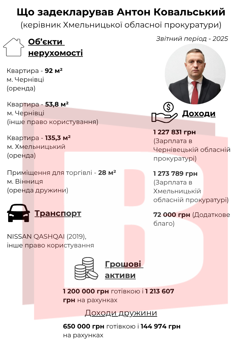 Свою декларацію про доходи головний прокурор Хмельниччини подав 24 березня, прозвітувавши за 2025 рік. Вказав житло в Чернівцях, а також орендовану квартиру в Хмельницькому. Окрім цього, в минулому році його дружина задекларувала два приміщення дляЯкі статки і майно задекларував?