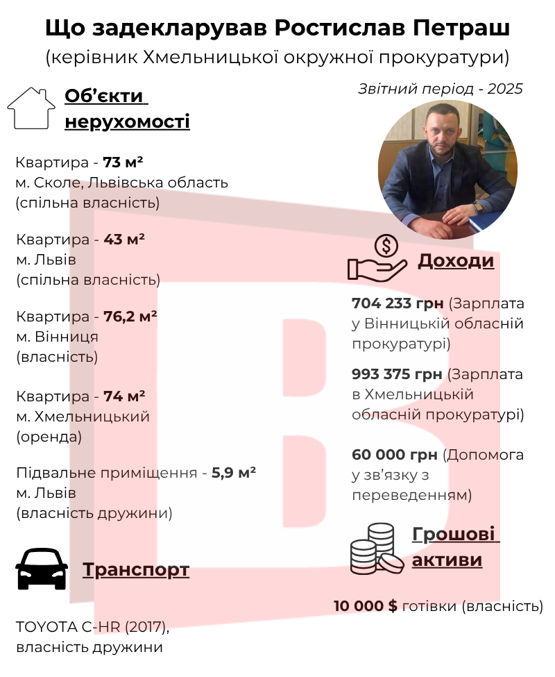 А от очільник окружної прокуратури міста Хмельницького Ростислав Петраш задекларував чотири квартири, дві з яких перебувають у спільній сумісній власності з дружиною. На посаді він заробив понад 990 тисяч гривень за рік. Також він зберігає понад 2 мільйони гривень на рахунках і готівкою.